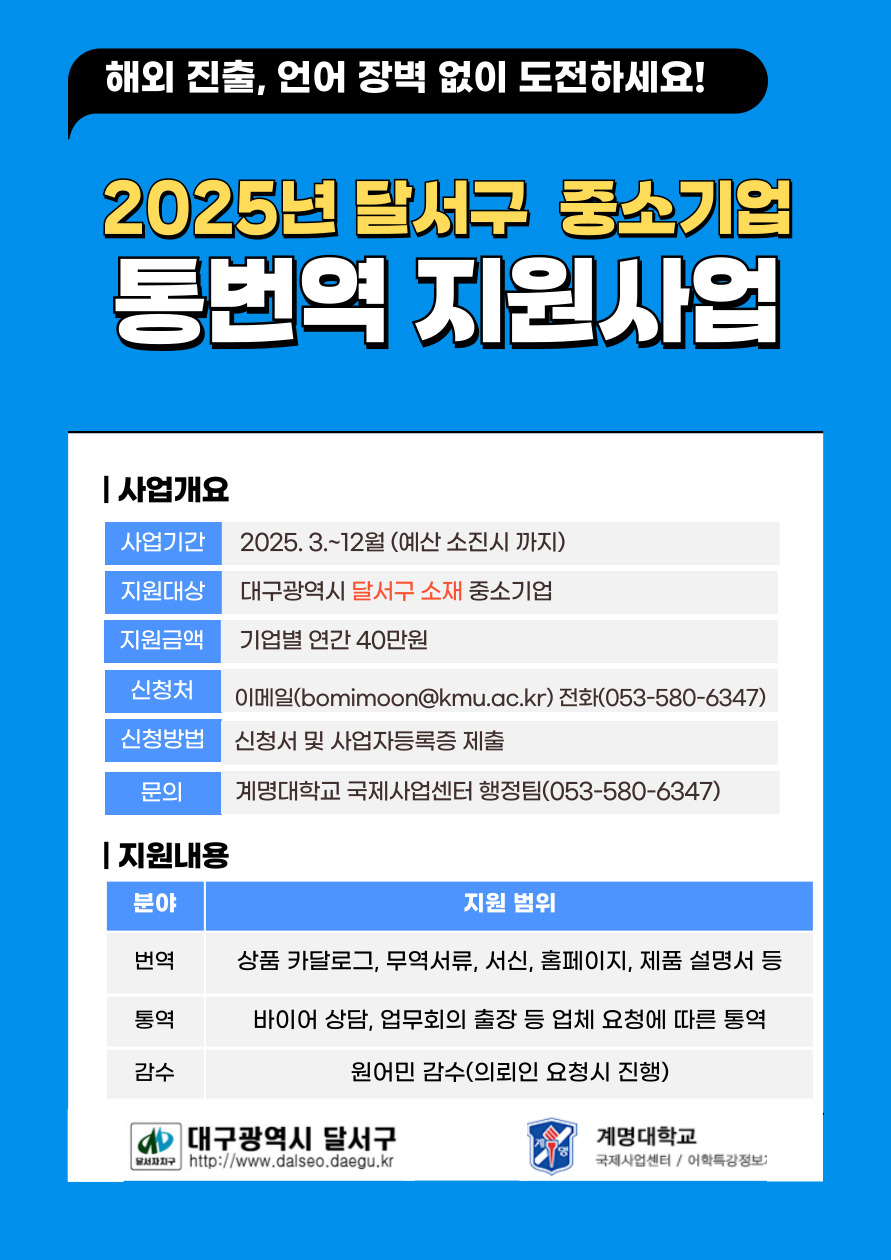 - 사업목적: 달서구 소재 중소기업에 필요로 하는 외국어 통번역 지원을 통해 수출활성화에 기여